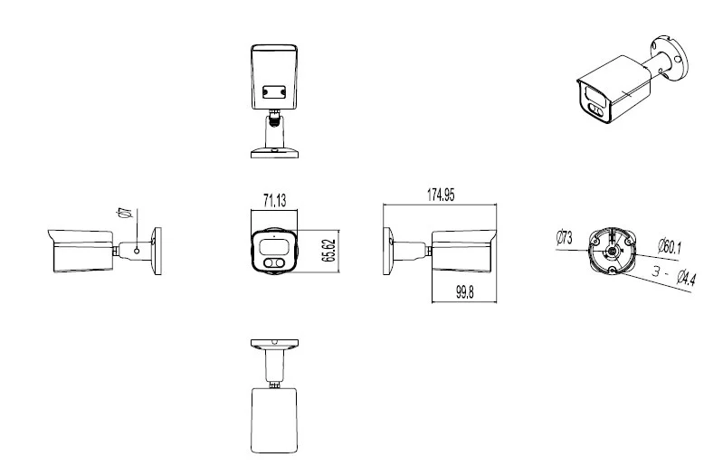 Bezpečnostní kamery je možné díky 3D držáku/3D základně namontovat na stěnu i strop a nastavit do prakticky jakéhokoli úhlu. Díky vysokému krytí IP67 a hliníkovému tělu je určena pro vnitřní a venkovní instalace, kde odolá rozmarům počasí po celý rok. Délka přívodního kabelu je 25cm a průchodu středem těla, proto je je možné kameru montovat přímo nad připravený otvor, do kterého se kabel zavede. Součást balení jsou vruty a hmoždinky. Kamera je také kompatibilní s kabelovým boxem.